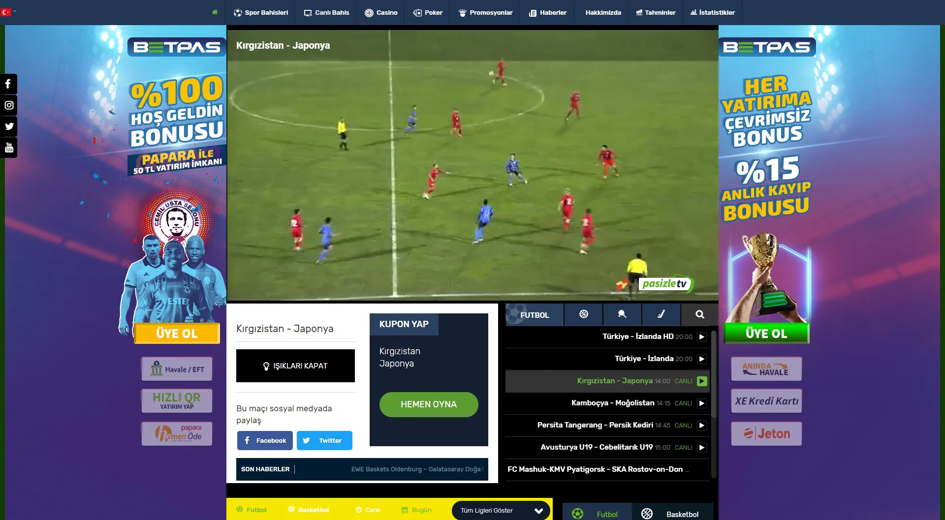 Her gün farklı maç seçeneklerine yer verilen Betpas TV, kesintisiz şekilde karşılaşmaları izlemek isteyenlere hizmet verir. Bahis severler bu sayede düzenli kupon hazırlayarak deneyimlerini arttırabilirler. Betpas sitesi Curaçao lisansına sahip olmasının yanı sıra 2011 yılında kurulmuştur. Düzenli yatırım yapmanız halinde ise kazanma şansınız daha çok artar.