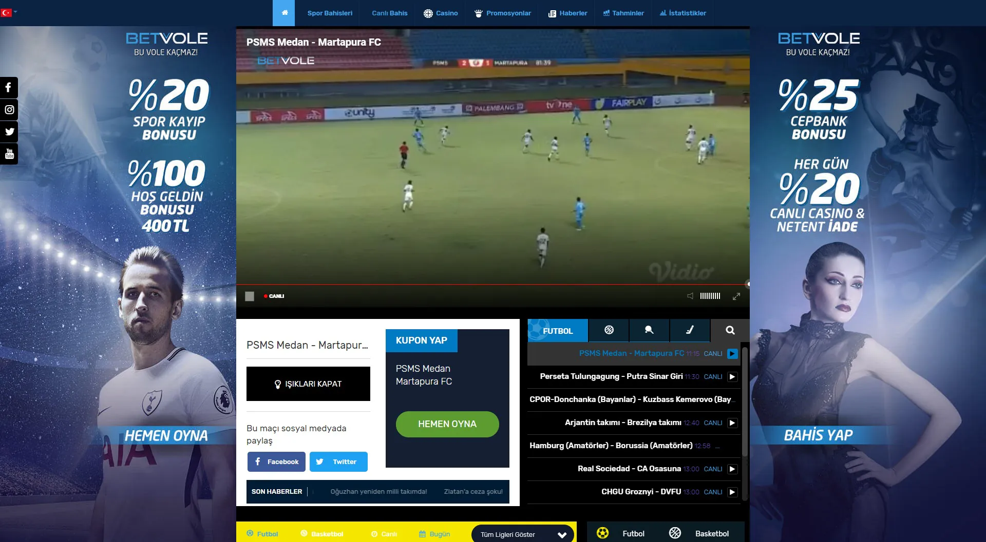 Betvole TV canlı maç izleme sayfasında aynı zamanda “Kupon Doldur” alanı da bulunur. Canlı maç seyrederken canlı bahis oynayabilirsiniz.