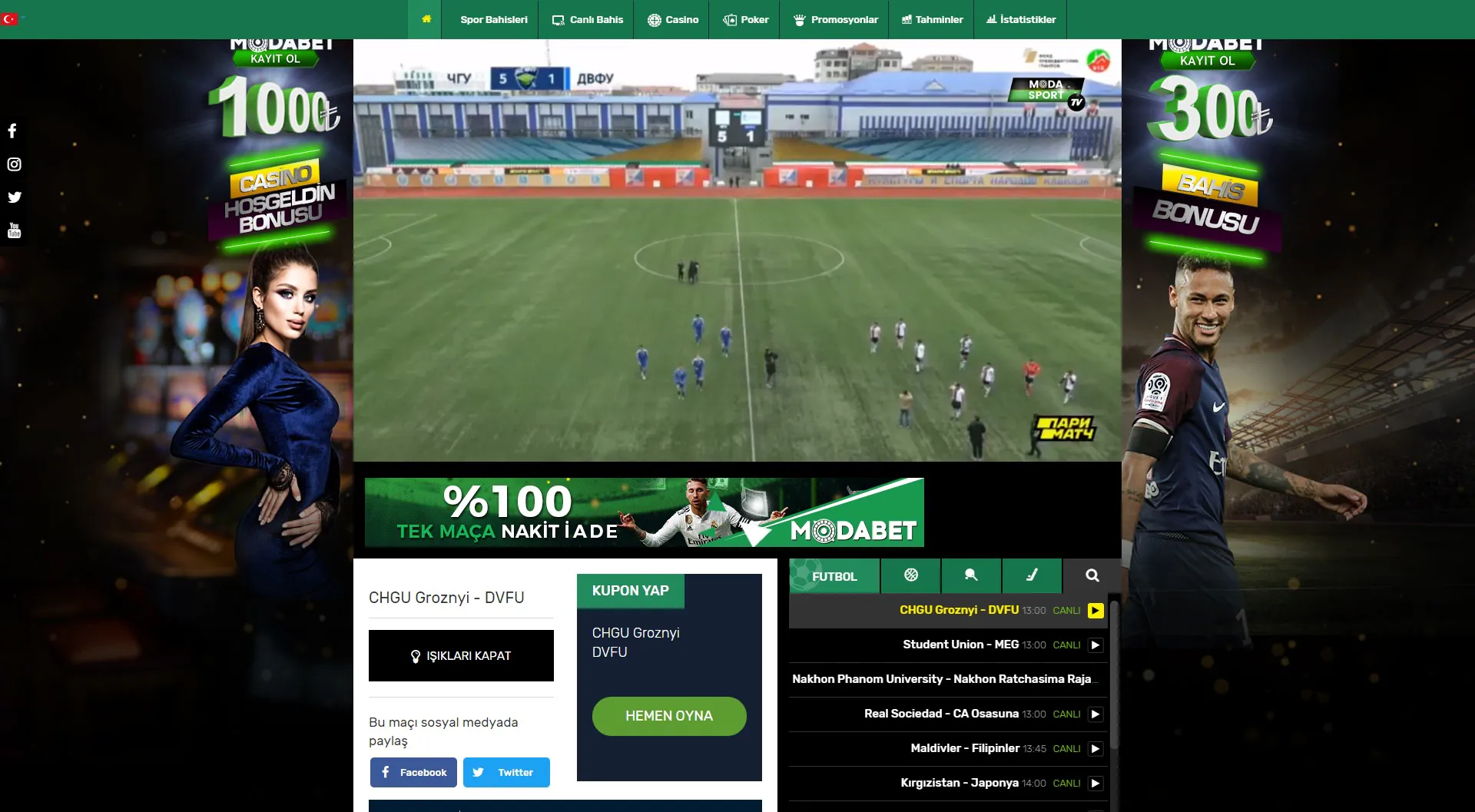 Modabet TV canlı maç seyret uygulaması tüm site üyelerine açıktır. Modabet online bahis sitesinde canlı maç seyrederken canlı oranlar üzerinden bahis oynayabilirsiniz. Tek maç için bahis oynayabileceğiniz gibi, kombine veya sistem bahisleri ile de şansınızı denemeniz mümkündür.